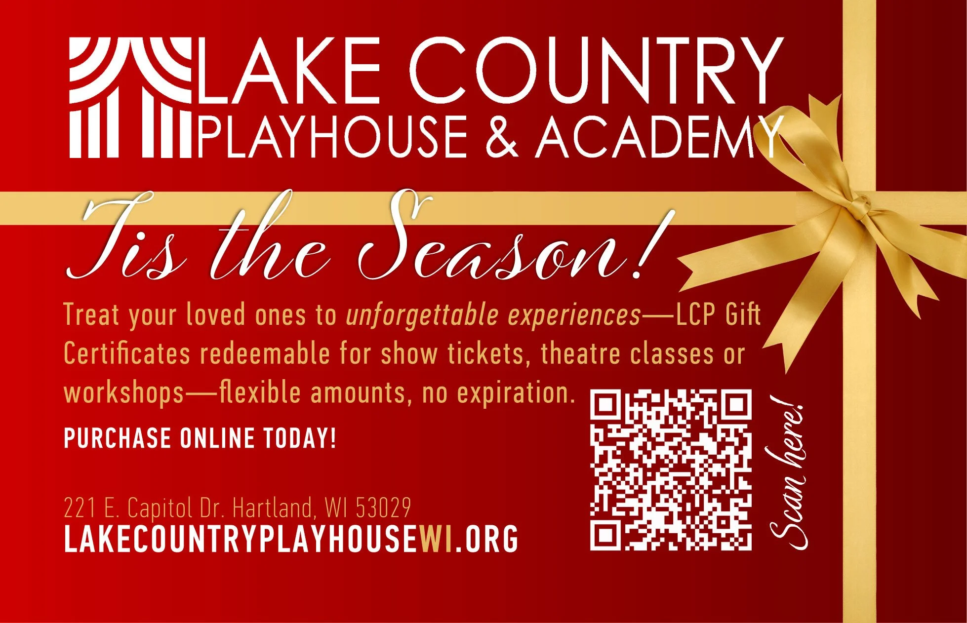 Delight your loved ones with an unforgettable experience — from captivating performances to engaging acting classes. Lake Country Playhouse & Academy gift certificates make the perfect present for any occasion.